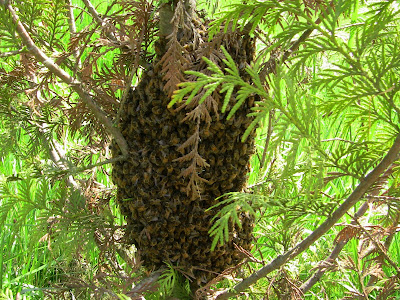 A couple weeks ago I received a call from my neighbor that my willow tree hive was swarming. Sure enough, I got home to find a decent swarm irritatingly clumped at the base of a tree at the edge of our yard: